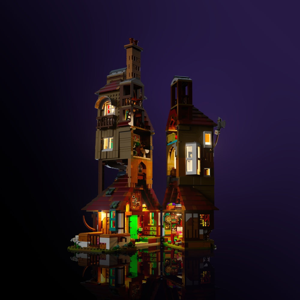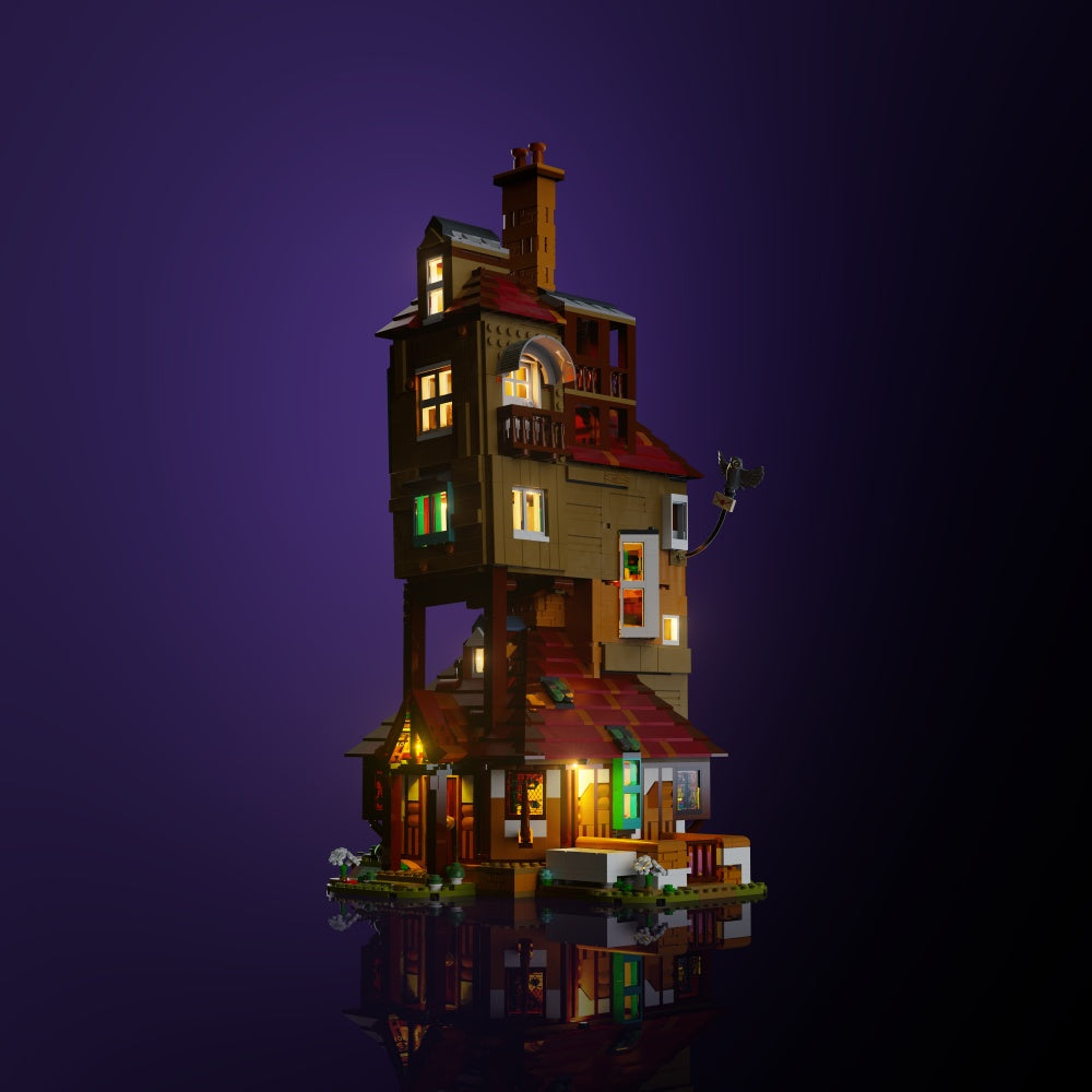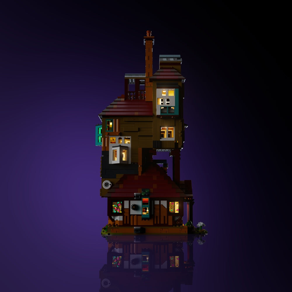 In brick form, the Weasley's family home is already an iconic set, but the real magic happens when you add lights! Featuring 13 spellbinding lights, you'll cast a warm and cosy glow throughout the interior and exterior of the Burrow, all designed to highlight the rickety look, wonky walls and tilted floors of the home.