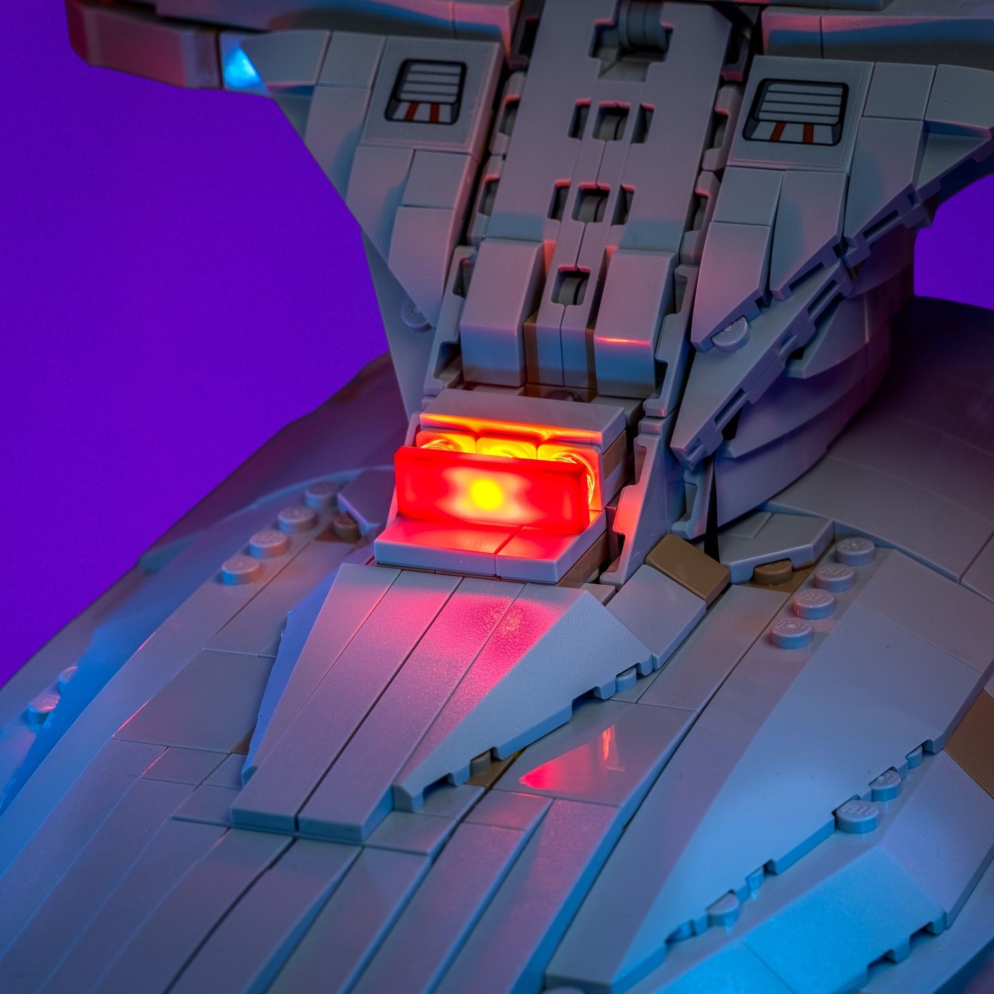 Engage at maximum brilliance with our custom Light Kit for the LEGO® Star Trek: U.S.S. Enterprise NCC-1701-D™ 10356, designed to capture the cinematic glow of the iconic starship from Star Trek: The Next Generation. A powerful cool white spotlight on the display stand bathes the saucer underside just like the show, while the Warp Nacelles burst to life with custom blue flare lights and vibrant red Bussard Collectors—ready to jump to warp in an instant. The stardrive section features an illuminated impulse engine and a glowing deflector dish in accurate orange and light blue tones respectively. The saucer section combines screen accuracy with artistic flair through its lit bridge, shuttle bay, orange impulse engines, and dramatic cool white spotlights inspired by modern Star Trek visuals. With every section thoughtfully illuminated, this kit transforms your Enterprise-D into a commanding showpiece worthy of Starfleet’s flagship.