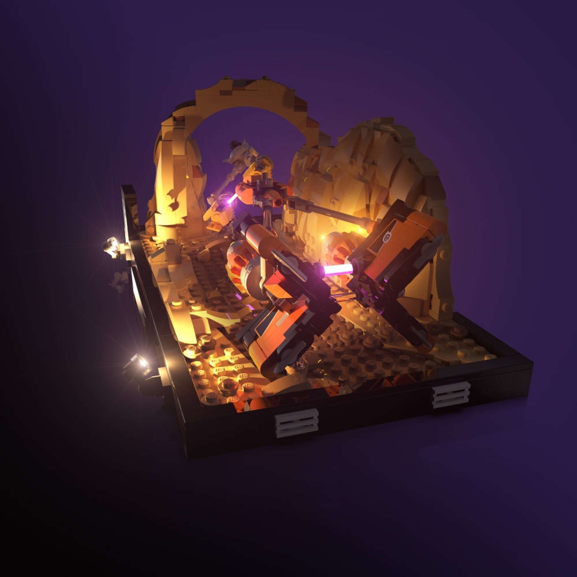 Featuring 8 seamlessly-integrated lights, you'll channel the force to build and light Anakin Skywalker and Sebulba's iconic Podrace on Tatooine in incredible detail. Starting with the Podracers, we've placed 2 of our custom pink Astro Lights to recreate the glowing energy binders that connect the engines, and an extra 4 warm white Astro Lights go in the engines themselves, emulating their fiery boost. A final 2 warm light Astro Lights go at the front of the diorama to light up the Tatooine desert scene.