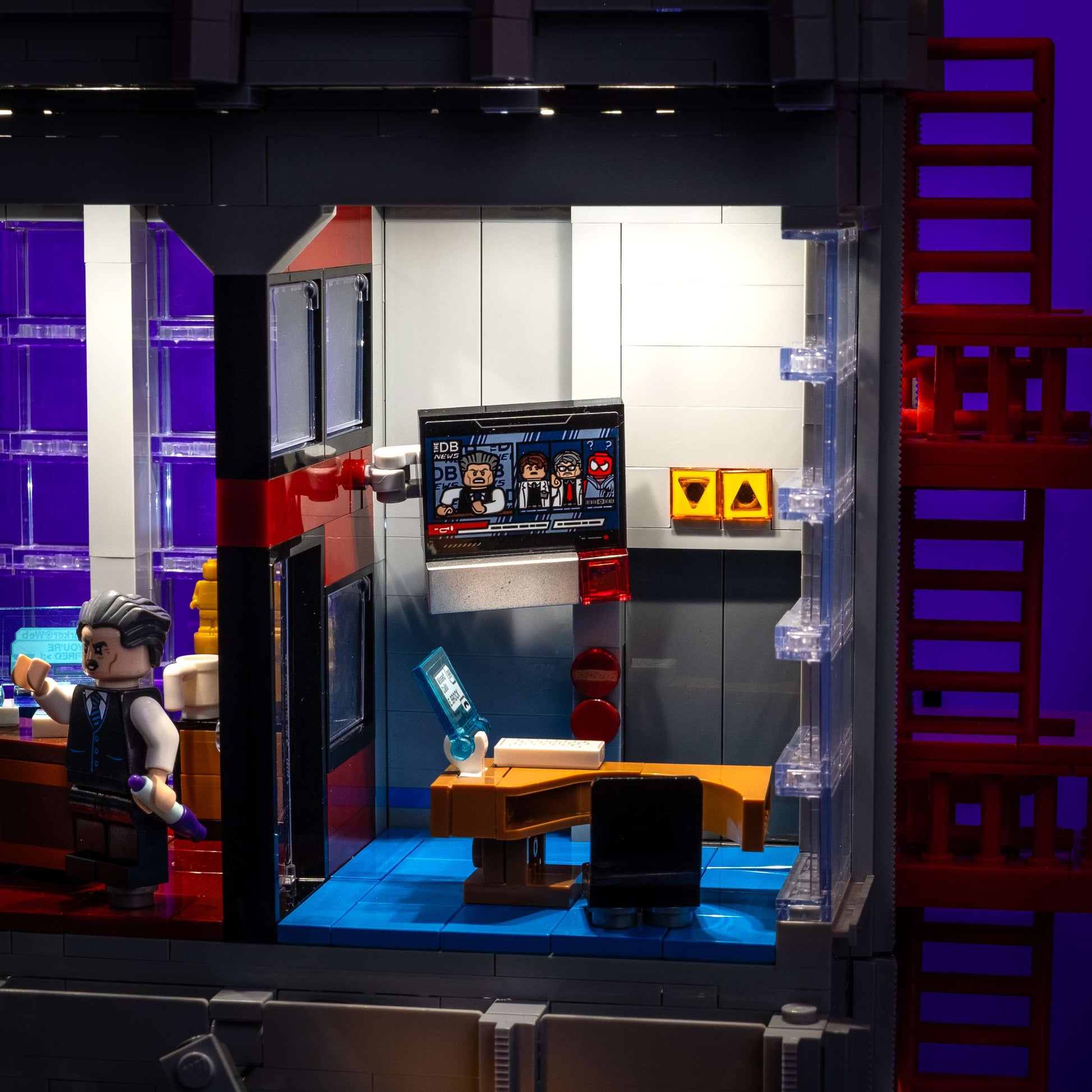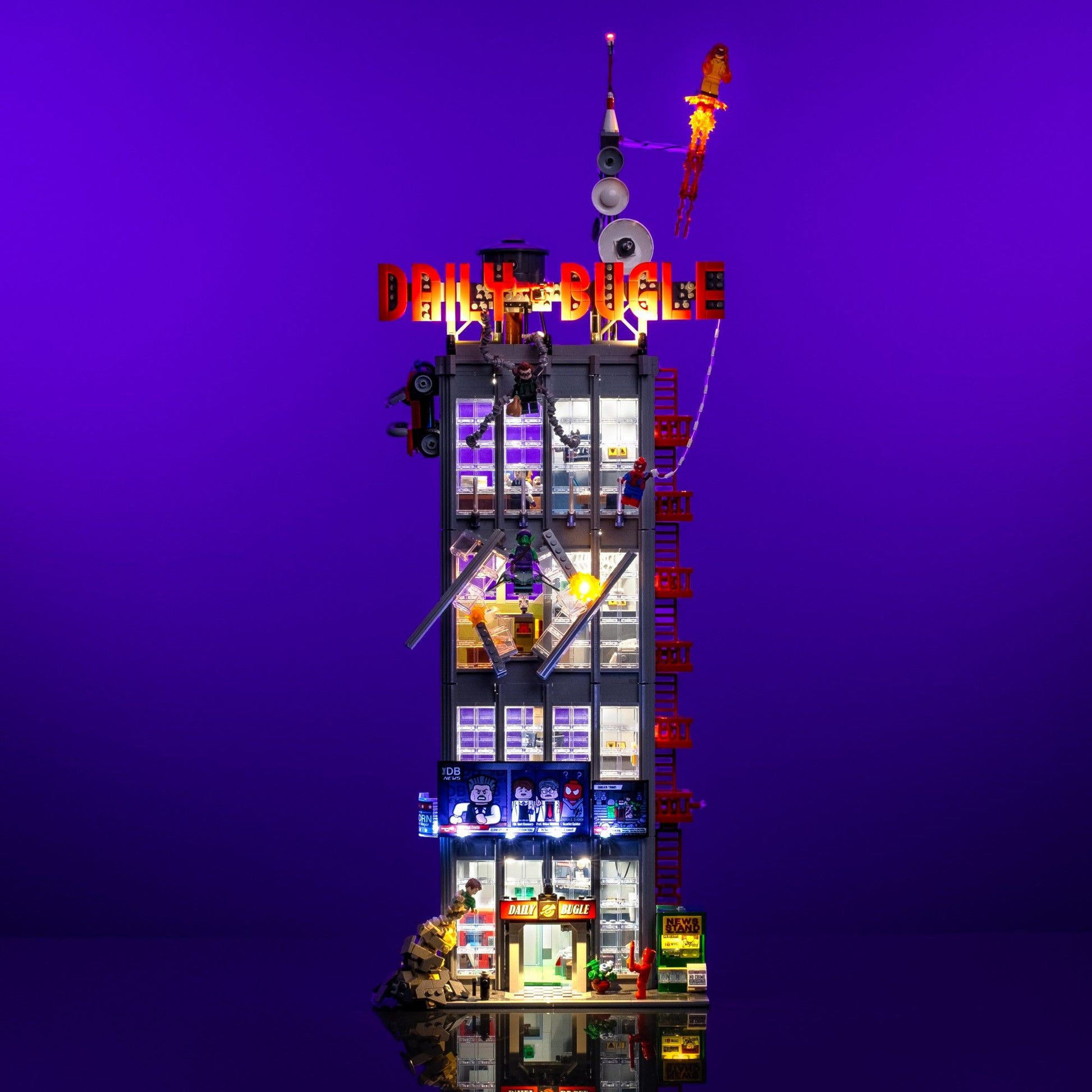 There’s nowhere to hide with the Light My Bricks™ custom light kit for the LEGO® Daily Bugle! Featuring 7 bright white meteor lights for the interior, dynamic flicker effects for explosive scenes, and cool spotlighting across the exterior. Our kit includes the iconic Bugle sign and News Stand and brings every superhero moment to life. With wireless flux touch plates between levels and cinematic lighting throughout, it’s the ultimate centrepiece upgrade for your Marvel display.