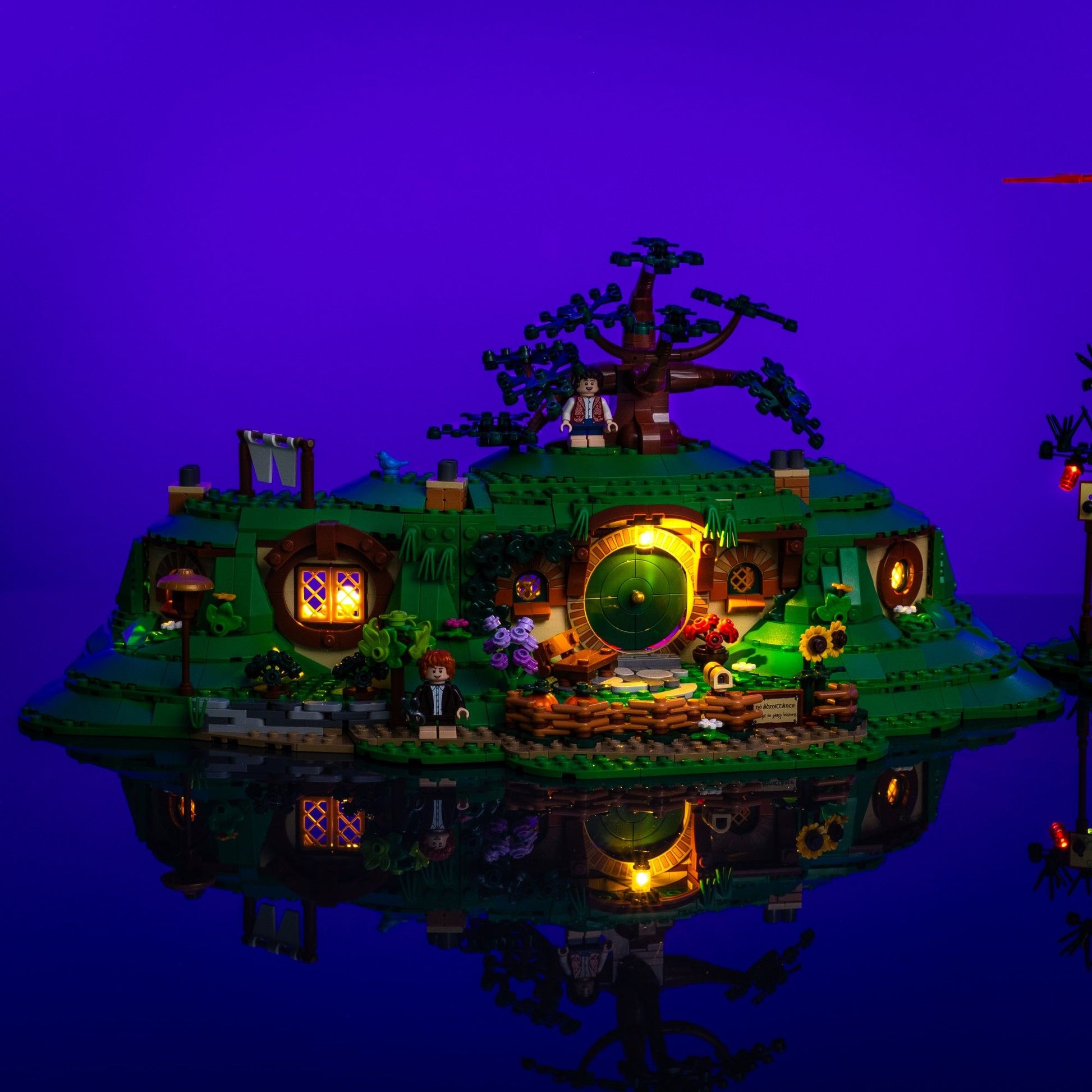 Each room in the hobbit-hole glows with warm, golden light that spills out through the windows, capturing the cozy charm of Bag End just like in the film.